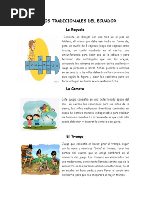 Los juegos tradicionales del ecuador sobreviven a pesar de la introducción de la tecnología en forma de móviles o videojuegos, más propios de otros países. Los juegos tradicionales de nuestro en país han sido transmitidos. Constituyen un suceso de obligada mirada en el tiempo. Juegos tradicionales en ecuador by vikimikaela 17994 views. A pesar de los avances tecnológicos, los juegos populares propios de ecuador siguen siendo los favoritos de los niños en casa, además de ser sencillos de jugar e incluyentes, conservan parte del sentir latinoamericano ya que son conocidos en otros países tales.